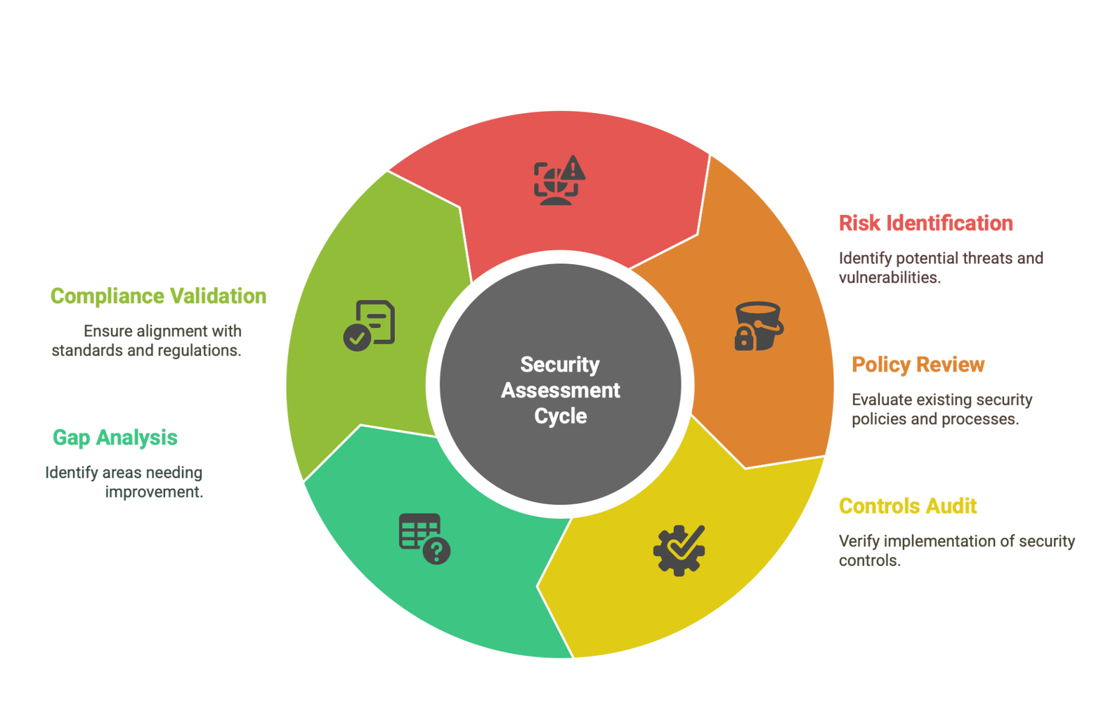We follow a systematic and comprehensive assessment methodology aligned with ISO 27001 standards to evaluate your organization's security controls, policies, and procedures: